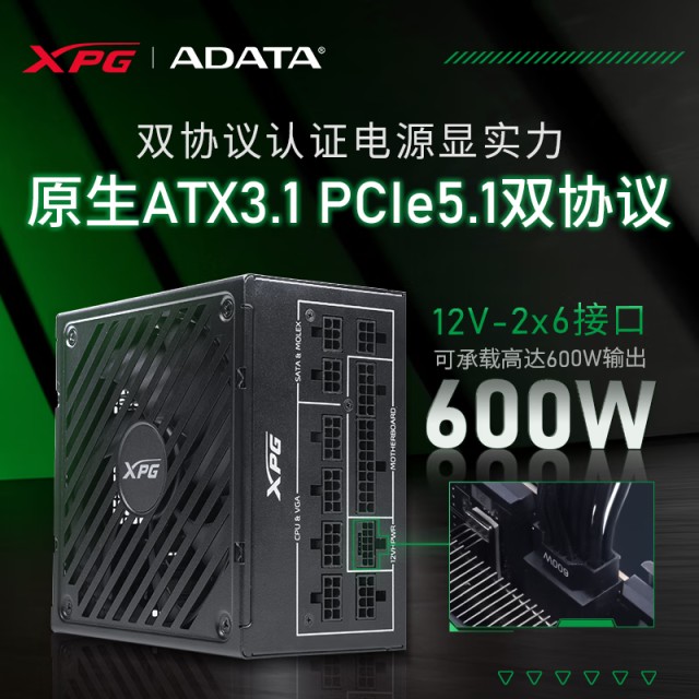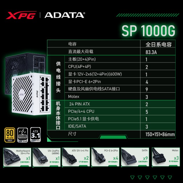 威刚XPG魔核SP1000G 白色金牌全模组 80PLUS 全日系电容 额定1000W 电脑电源