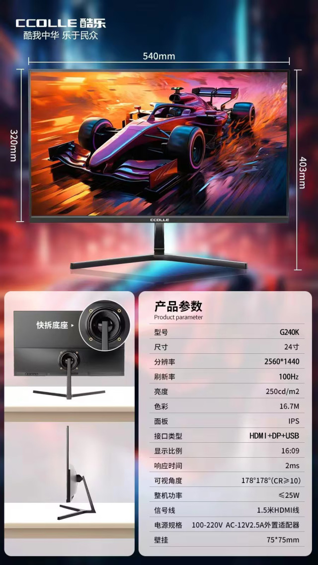 酷乐G240K-1 24寸2K 100Hz平面无边框娱乐办公高清显示器 V型底座 支持HDMI+VGA接口