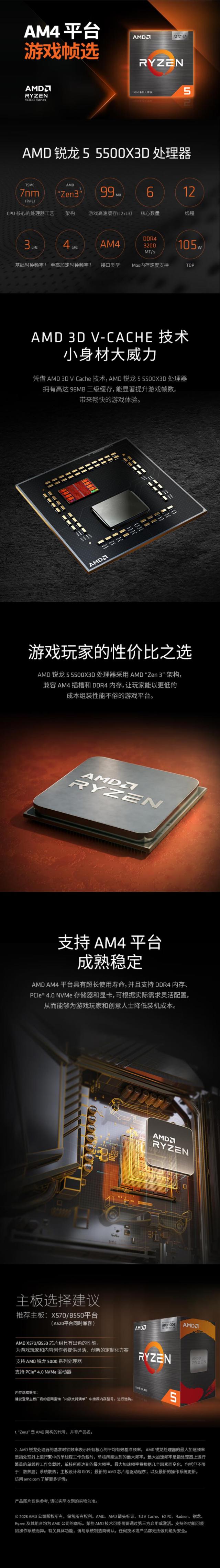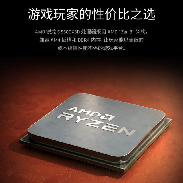 AMD 锐龙R5 5500X3D 台式机CPU处理器 7nm 6核12线程 加速频率至高4.4GHz AM4盒装