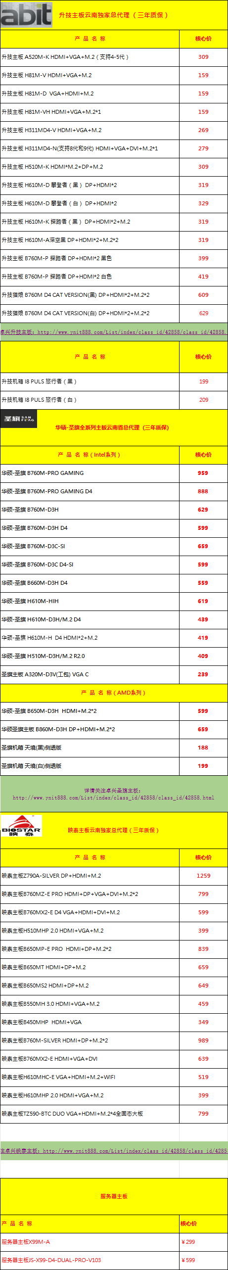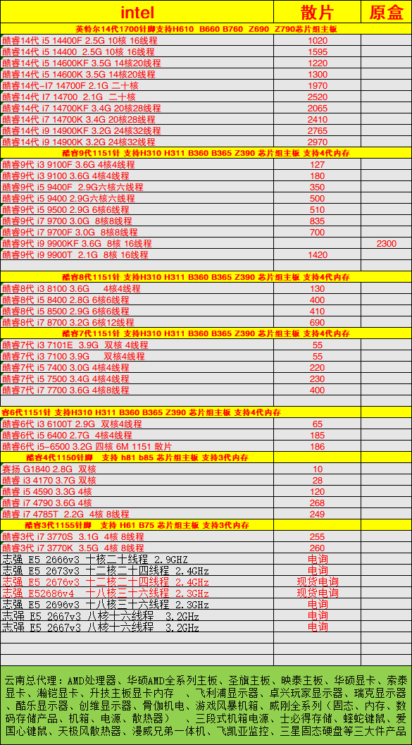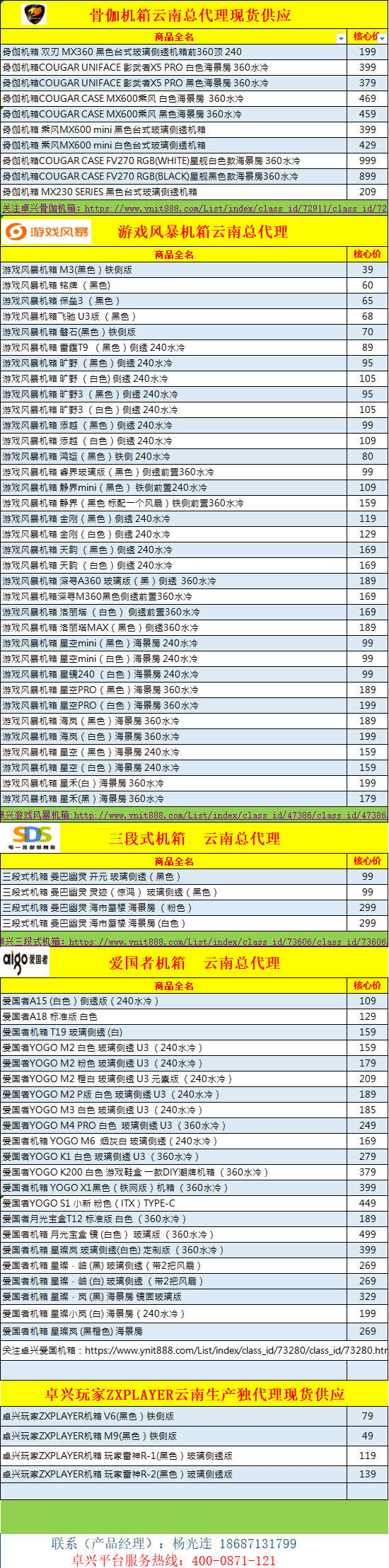 云南总代理:AMD蓝宝石主板、蓝宝石显卡全系列、AMD处理器、华硕AMD全系列主板、圣旗主板、映泰主板、华硕显卡、索泰显卡、瀚铠显卡、升技主板显卡、磐正显卡、飞利浦显示器、卓兴玩家显示器、瑞克显示器、酷乐显示器、创维显示器、游戏风暴机箱、威刚全系列(固态、内存、数码存储产品、机箱、电源、散热器)、三段式电源、士必得固态、蝰蛇键鼠、爱国心键鼠、天极风散热器、漫威兄弟一体机、长城一体机、飞凯亚监控、三星固态硬盘、三大件产品机箱、电源、散热器