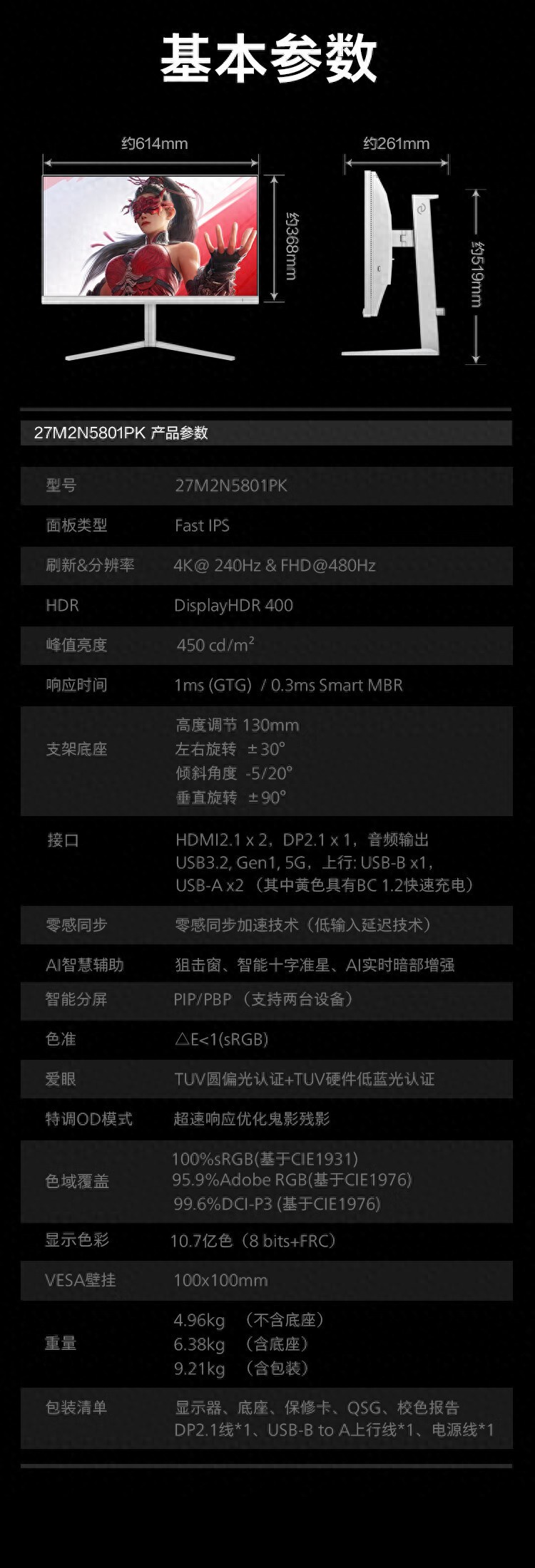 27M2N5801PK 采用 27 英寸 Fast IPS 面板,GtG 响应时间 1ms,HDR 峰值亮度 450nits,获得 VESA DisplayHDR 400 认证,色域覆盖 99.6% DCI-P3、95.9% Adobe RGB,sRGB 下 ΔE<1。HDR亮度达到450尼特,打游戏、看电影都够用,低蓝光是硬件级的,调光也用DC,看久了眼睛没那么累,支架能升能降能歪,接口有DP2.1和HDMI2.1,新显卡也能直接连上。