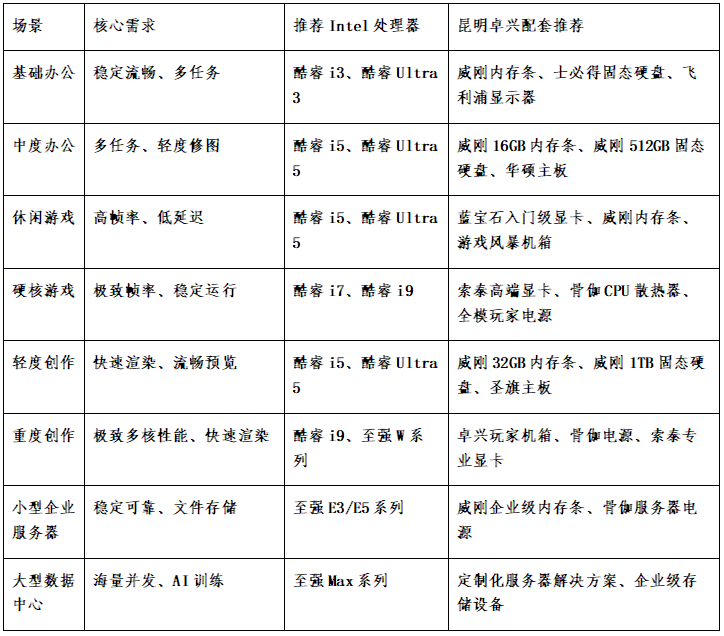 下面咱们针对四个最常见的场景,详细说说该怎么选Intel处理器,同时结合昆明卓兴的代理产品,给大家一些具体的装机建议(不涉及价格,只讲搭配逻辑)。