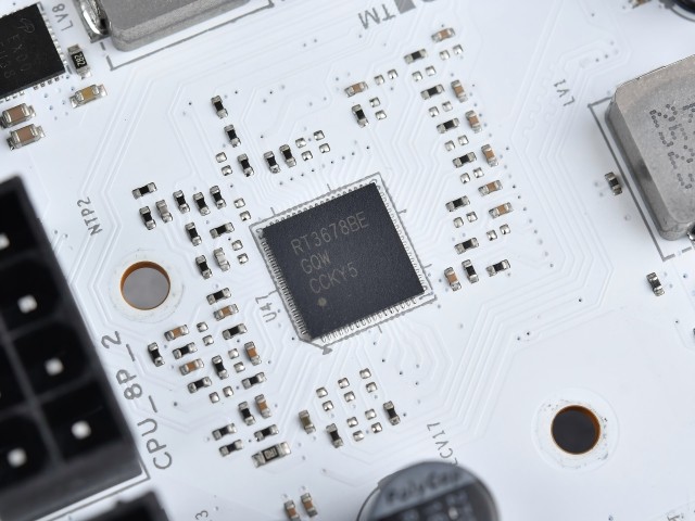 再跟大家说两个关键的供电元件:这款主板的PWM控制器是RT3678BE,它就像是供电系统的“指挥官”,负责调节供电的电流和电压,确保供电稳定。而核心16路供电采用的是AOSMD AOZ5510QI元件,每一路都能支持55A的电流,这套供电模组整体能输出170W以上的功耗。