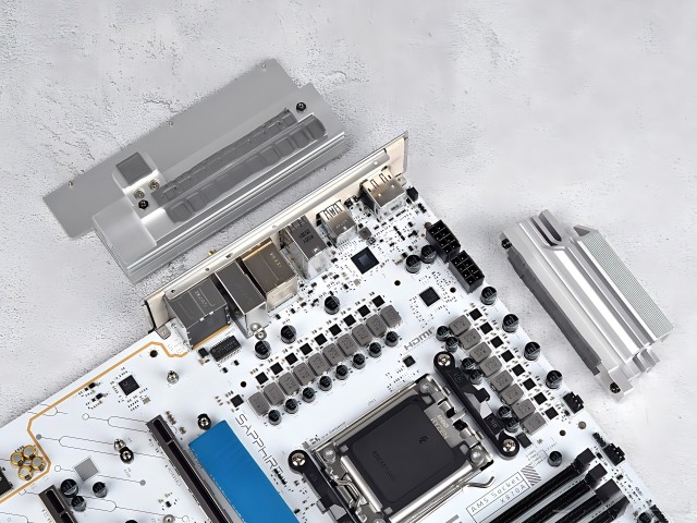 供电强,散热也得跟上。蓝宝石为供电系统配备了一套厚实的金属散热装甲,而且是两片独立的装甲,分别覆盖在核心供电和辅助供电区域。更贴心的是,在MOS管上还配备了导热垫,能增强散热效果。就算CPU长时间满负载运行,供电区域的温度也能控制在合理范围内。