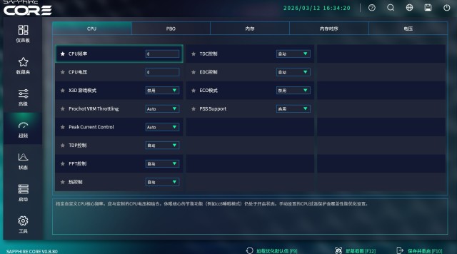 接下来就是超频菜单。蓝宝石的BIOS采用横版界面,进入后能一眼看到整个页面的所有功能。这个菜单主要用来调节CPU超频的频率、电压等参数,还有X3D处理器专属的X3D游戏模式。
