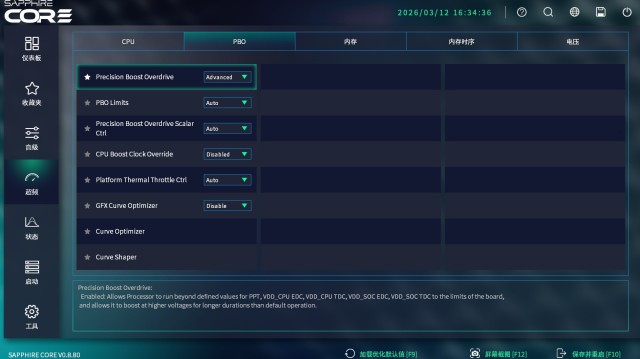 在超频菜单的右边,就是PBO超频页面。PBO是AMD平台特有的超频方式,和手动超频相比更安全、更简单。主板会根据CPU的体质和散热情况,自动提升CPU的频率。