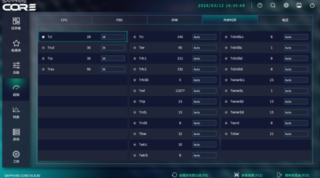 在PBO超频页面的旁边,是内存超频页面,主要用来调整内存频率相关的设置。而内存时序界面用来调节内存的小参时序。对于新手来说,不建议手动调节内存时序,开启EXPO或XMP一键优化即可。
