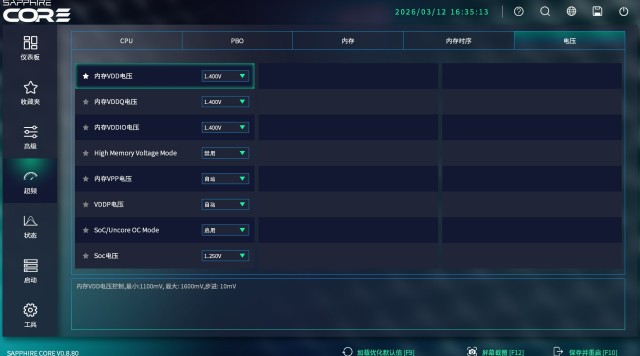 最边上的是CPU和内存电压设置页面。普通玩家只需要调整内存电压即可(开启EXPO后主板会自动设置),CPU电压尤其是SOC电压,新手不建议碰。