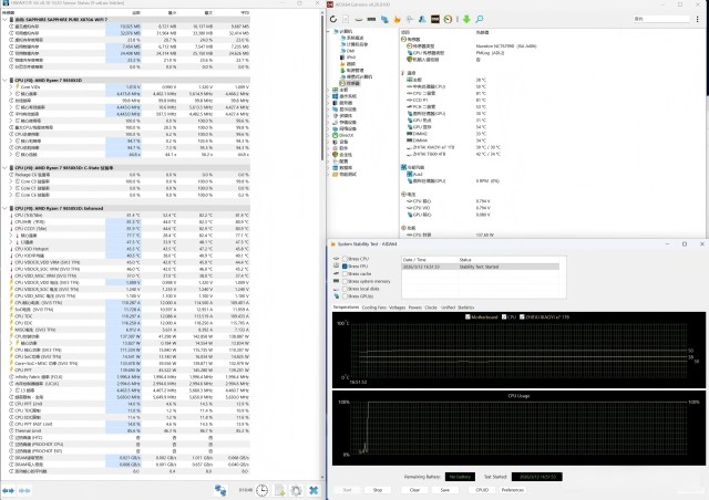使用AIDA 64 FPU单拷模式,开启PBO,测试30分钟。结果显示:锐龙7 9850X3D最大功耗142W,平均135W左右;最高温度82.2℃,平均78℃左右。30分钟拷机过程中,主板运行非常稳定,没有出现卡顿、死机、蓝屏,CPU频率和电压保持稳定。