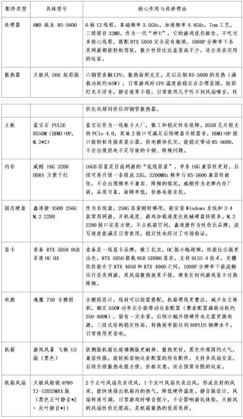 看完实测数据,很多玩家可能会好奇,为什么R5-5600+RTX 5050这套配置能在三款热门网游中都有不错的表现?其实核心原因就是“搭配均衡”,没有明显瓶颈,同时硬件品质可靠、散热稳定,接下来我从三个方面详细分析,让大家明白这套配置的优势和短板。