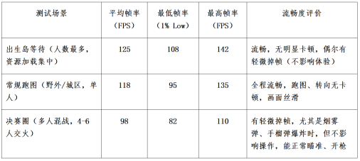 出生岛因为人数多、资源加载集中,帧率会有轻微波动,最低能到108 FPS,这是正常现象,几乎所有主机在这个场景都会出现轻微掉帧。常规跑图时,帧率稳定在118 FPS左右,跑图、转向、瞄准都非常跟手,不会因为帧率问题导致操作失误。决赛圈多人混战时,帧率会降到98 FPS左右,最低82 FPS,偶尔有轻微卡顿,但不影响核心操作,依然能正常“吃鸡”。
