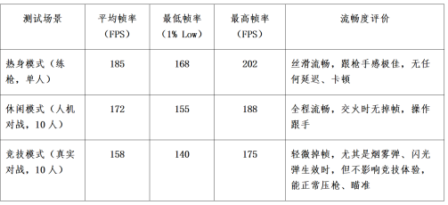《CS2》的实测结果非常让人满意,完全能满足普通玩家的竞技需求。高画质下,平均帧率轻松突破150 FPS,热身练枪时更是能达到185 FPS以上,最低帧率也稳定在140 FPS以上,远超144Hz显示器的刷新率,画面流畅到几乎没有延迟。