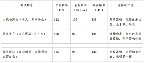 在大战场跑图时,帧率稳定在122 FPS左右,画面丝滑,转向、移动无任何卡顿;据点争夺多人混战时,帧率会降到108 FPS左右,最低92 FPS,偶尔有轻微掉帧,但不影响核心操作,能正常开枪、走位、躲掩体;摸金玩法的复杂场景中,光影效果复杂,资源加载量大,但帧率依然能维持在115 FPS左右,没有出现卡顿、闪退问题。