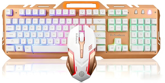 • 键盘:悬浮式按键设计,机械手感,按下去反馈清晰,打字、玩游戏都很舒服,长时间使用也不会觉得累;土豪金配色,搭配背光效果,颜值很高,和白色机箱搭配,黑白金撞色感十足,很有质感;支持多种背光模式,可根据喜好调节,晚上使用也很方便;键盘采用加固铝制设计,不易变形,耐用性强,双shot ABS键帽,舒适又耐磨,不易掉漆。