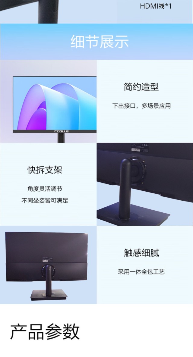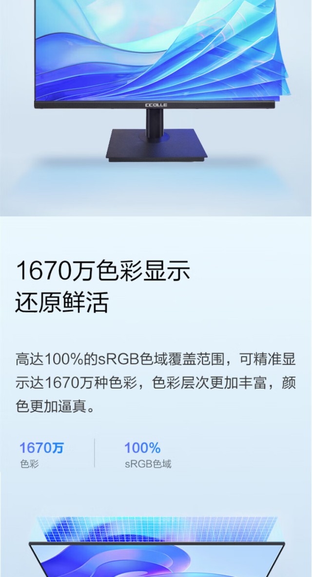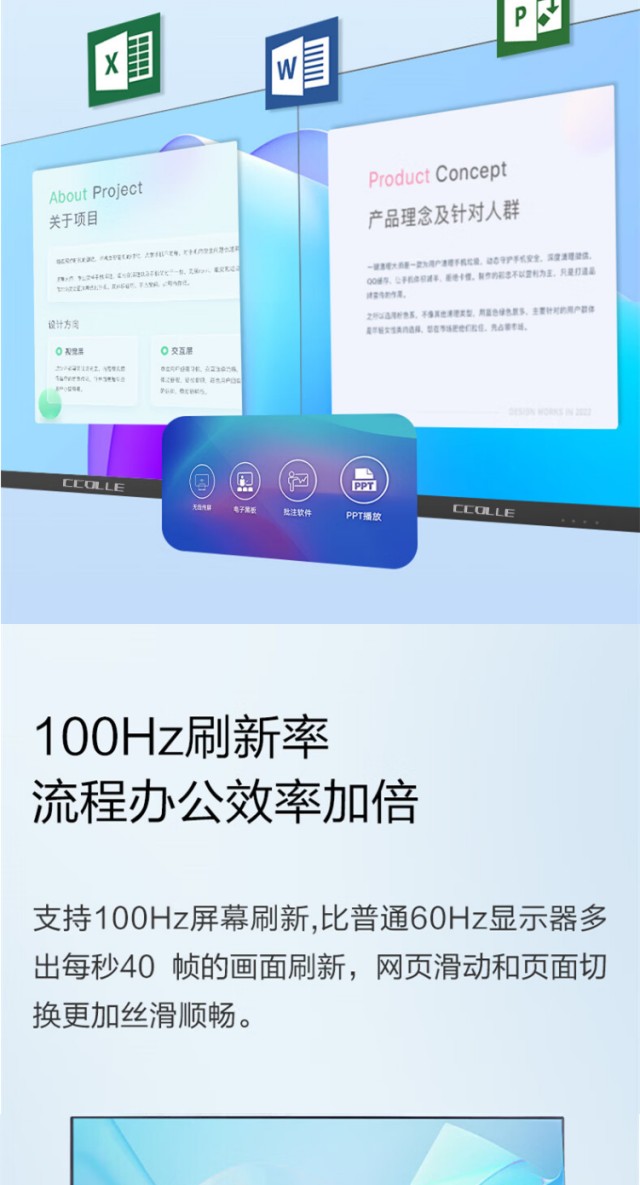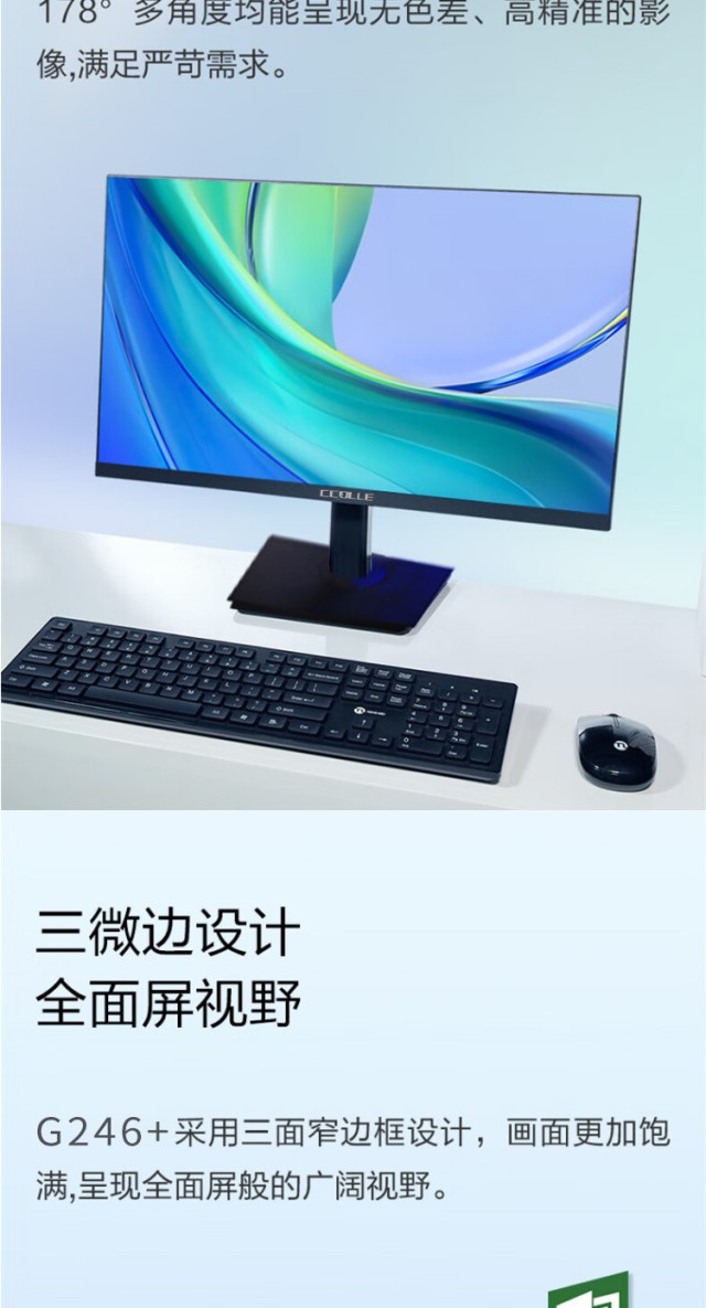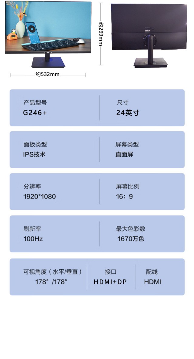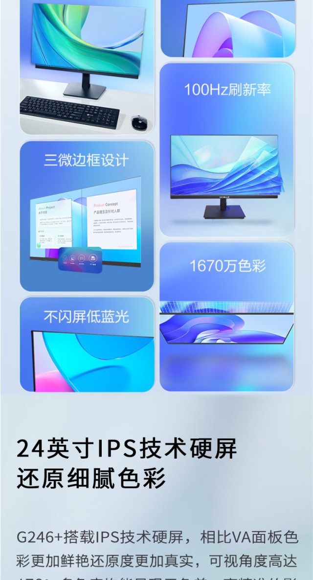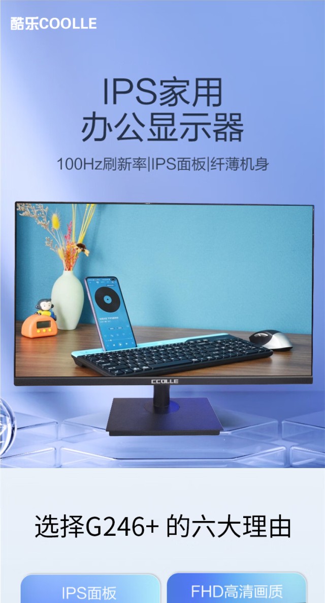 酷乐COOLLE G246+ 24寸lPS显示器 1K/100Hz高刷 超薄微边框 低蓝光不闪屏液晶屏
