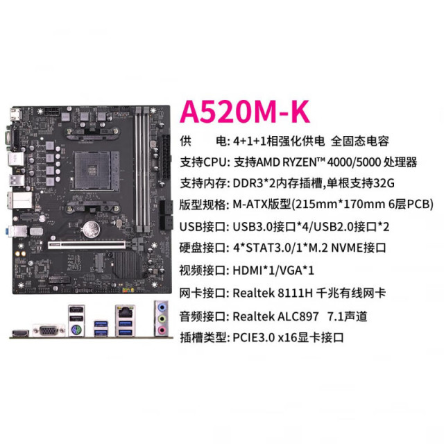 升技A520M-K主板 支持HDMI+VGA+M.2