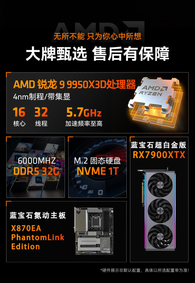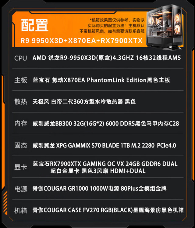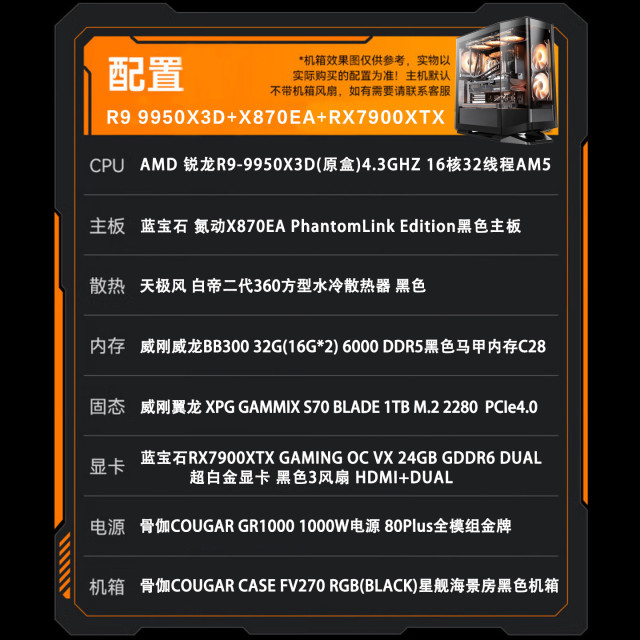 在DIY主机领域,旗舰级配置往往追求性能无短板、体验无瓶颈,既能轻松驾驭各类3A大作的满画质运行,也能从容应对专业生产力场景的高强度需求。本次解析的这套DIY主机配置,以AMD锐龙R9-9950X3D为核心,搭配蓝宝石RX7900XTX旗舰显卡及全套高规格硬件,整体定位高端发烧级,下面将从配置兼容性、性能表现、潜在优化空间等方面,进行全面细致的分析,为装机提供参考。