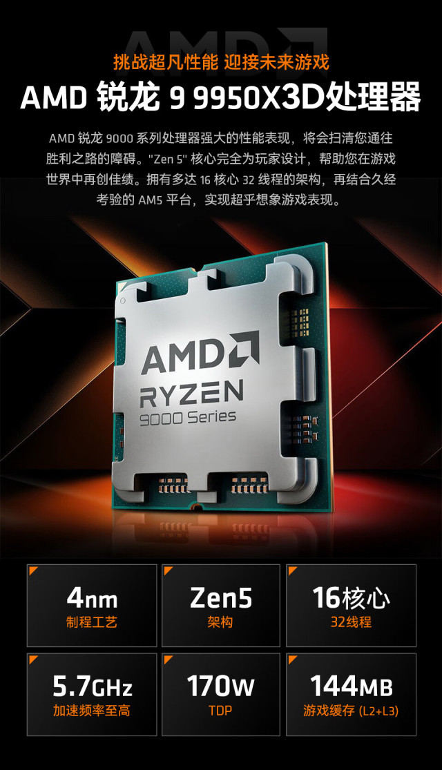 CPU:AMD 锐龙 R9-9950X3D (原盒) 4.3GHZ 16 核 32 线程 AM5 三年包换
