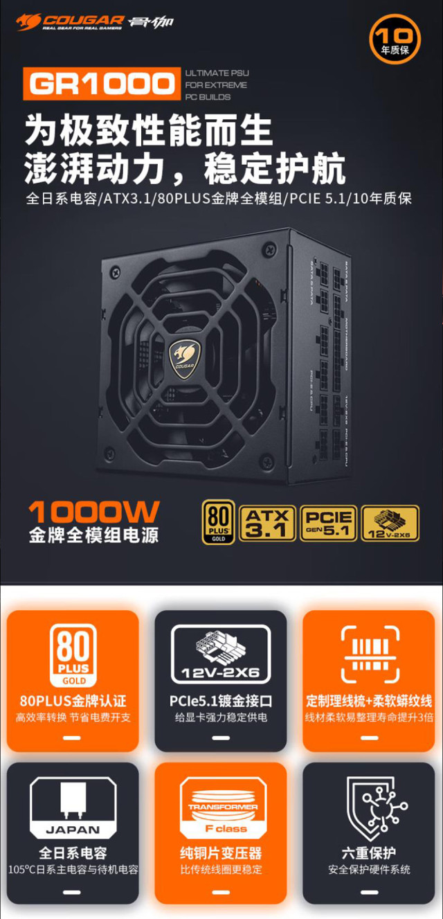 电源 :骨伽 COUGAR GR1000 1000W 电源 80Plus 全模组金牌 三年包换
