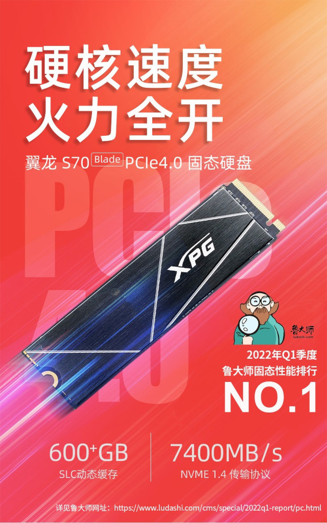 固态 :威刚翼龙 XPG GAMMIX S70 BLADE 1TB M.2 2280 PCIe4.0 三年包换