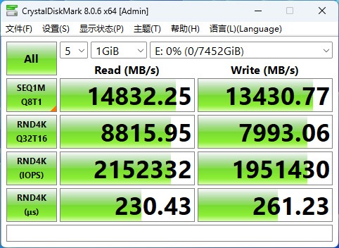 在性能测试环节,我们首先进行的是CrystalDiskMark的空盘测试。结果显示,在1GiB的Seq Q8T1读写测试中,读取速度达到了14832.25MB/s,而写入速度则为13430.77MB/s,这两项指标均超过了三星官方公布的标称值。在4K随机读写性能方面,我们得到了读取2152K IOPS和写入1951K IOPS的结果,整体性能十分出色。