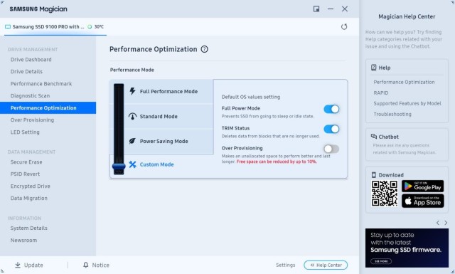 同时测试期间,我们采用自定义的模式,即功耗全开、TRIM功能开启,只是把OP空间给关掉。