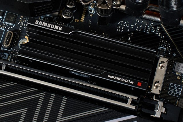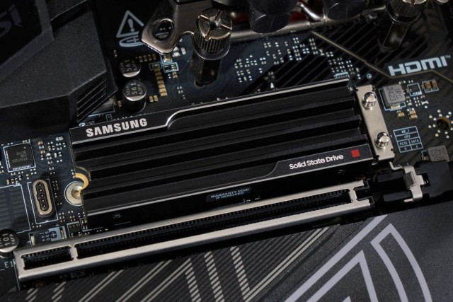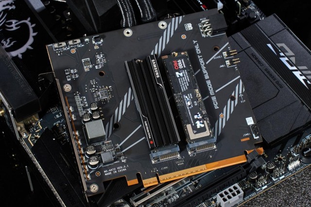 而三星 9100 PRO 8TB散热片版由于底部较厚,因此主板原配的底部散热马甲需要拆掉才能很好地安装到M.2_1插槽上。