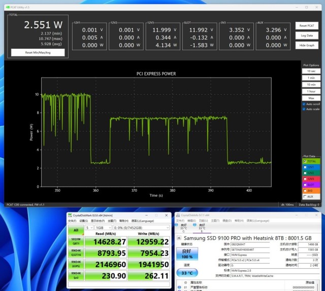 在功耗测试方面,我们在微星M.2 Xpander-Z Gen 5扩展卡上安装了NVIDIA PACT功耗测试仪。借助PCAT记录CrystaldiskMark运行时的功耗情况,从PCAT软件中可以得知,三星9100 PRO 8TB的待机功耗为2.137W,CrystaldiskMark测试时的最大功耗为10.747W。