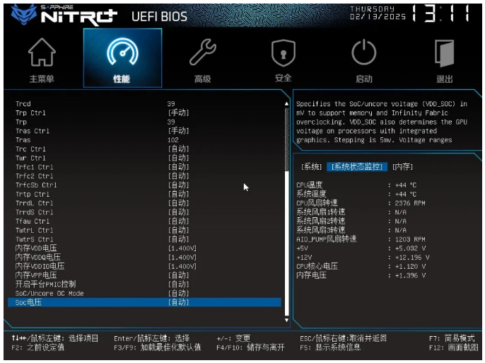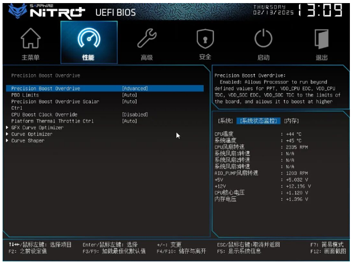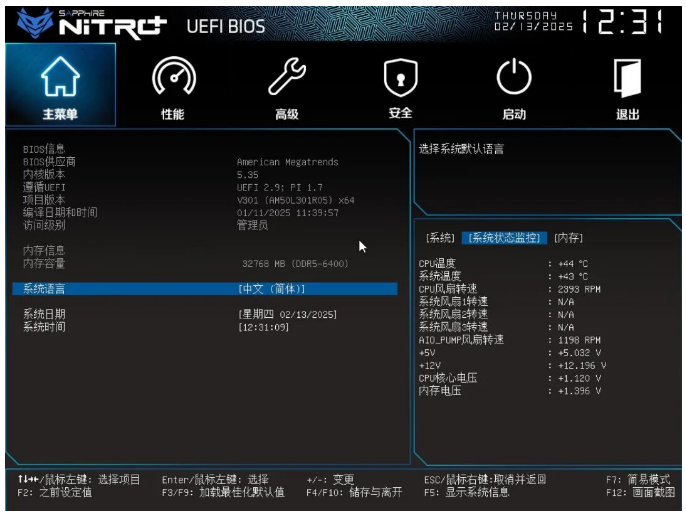 下面我们来看一下蓝宝石NiTRO+ 氮动 B850M WIFI主板的BIOS,目前蓝宝石主板已经升级为图形化菜单,进入主菜单来到简易模式可以看到XMP/EXPO、PBO、风扇这些快捷预设选功能,并能查看一些硬件参数信息。