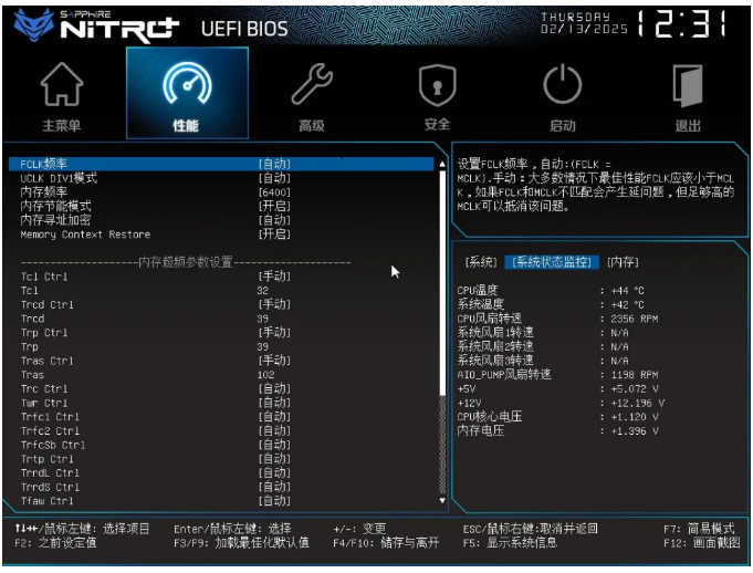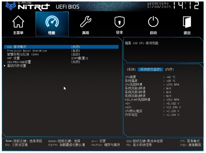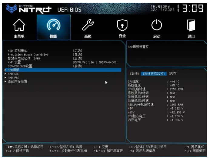 接着来到重要的性能页面,可以看到针对X3D处理器的游戏模式开关,以及PBO、内存等功能调节。
