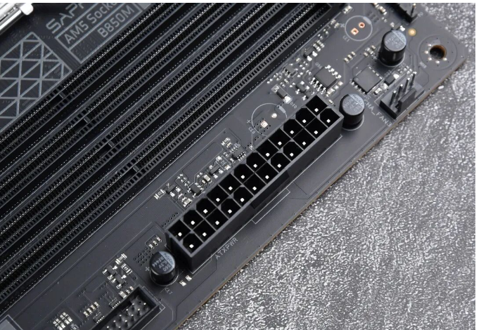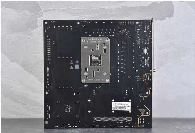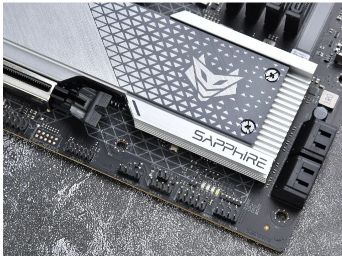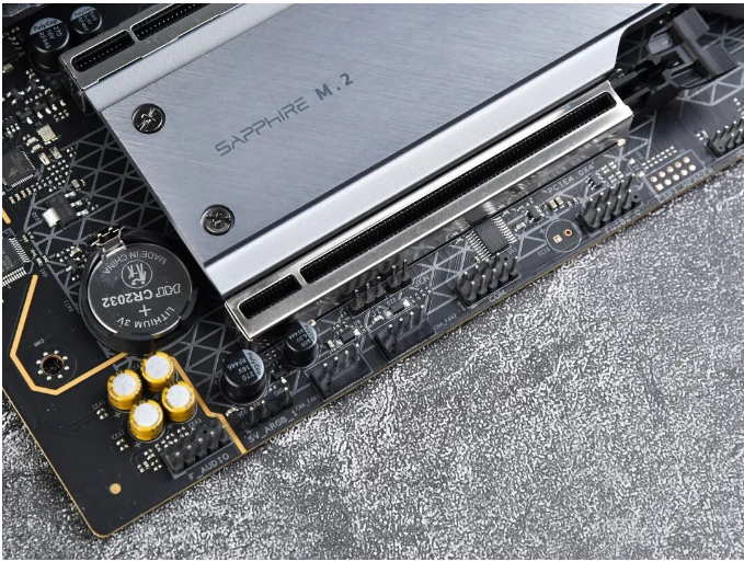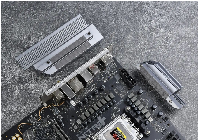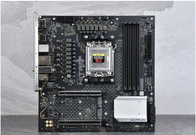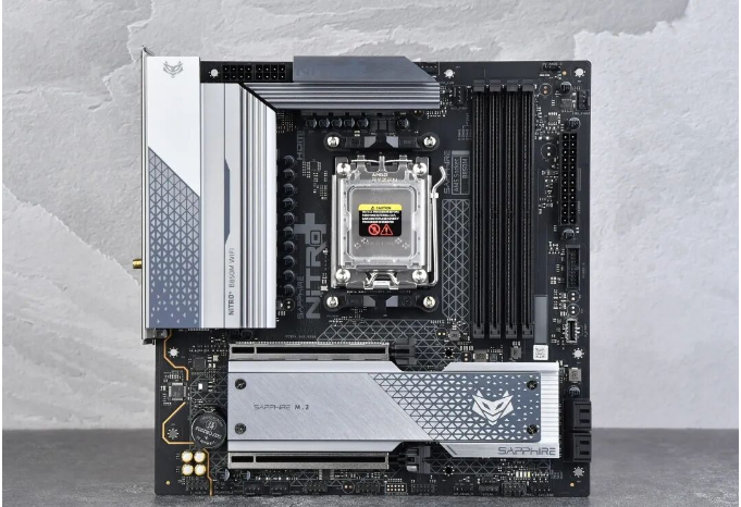大家应该都发现了目前大部分B650/B850的M-ATX型号主板。直连CPU的M.2接口都从显卡插槽下上方移到了下方,这主要是受制于AM5插槽的影响。不过蓝宝石NiTRO+ 氮动 B850M WIFI主板的显卡槽没有下沉,显放一槽能提升一定进风效率,同时要使用4槽规格显卡和中小机箱的话,还可以避免显卡贴地飞行,挡住下方I/O接口线。