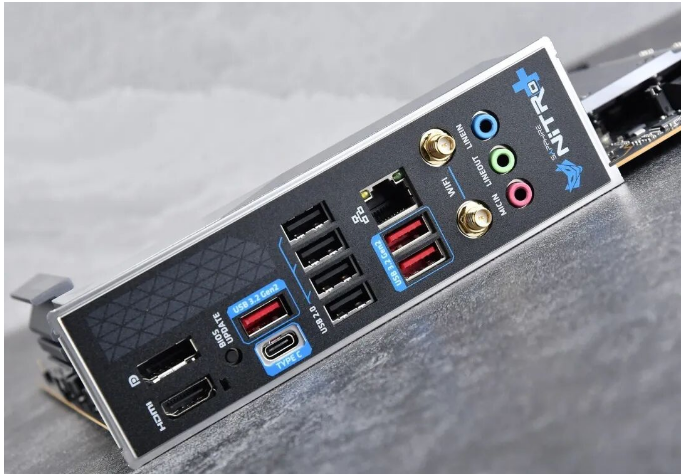 I/O区域,蓝宝石NiTRO+ 氮动 B850M WIFI主板预装了I/O挡板,总共提供了8个USB接口,包含4个USB 2.0接口,3个USB 3.2 Gen2 Type-A接口以及1个USB 3.2 Gen2 Type-C接口。