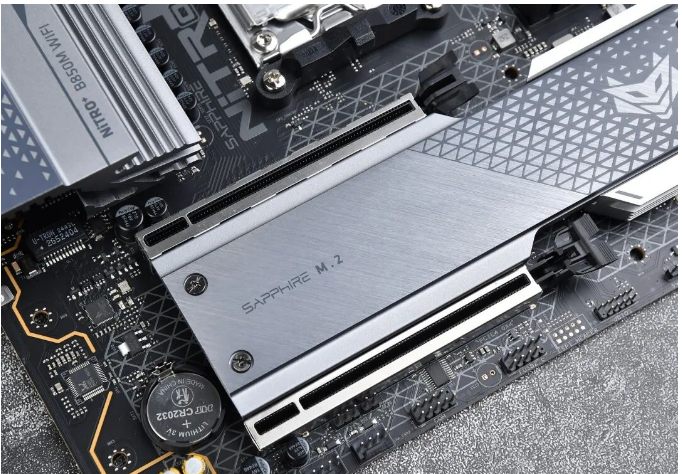 PCIe插槽上,蓝宝石NiTRO+ 氮动 B850M WIFI主板提供两根PCIe全场插槽,并且都使用了金属加固,对于目前体积重量越来越大的显卡来说,金属装甲可保证PCIe不会轻易压弯变形。