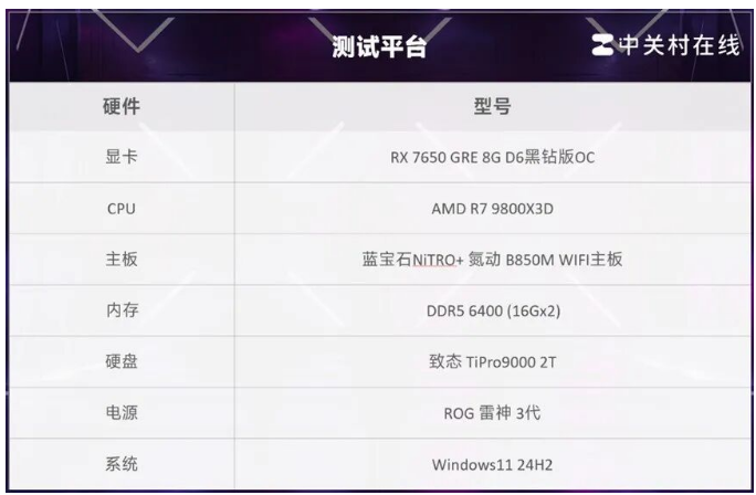 本次测试搭配了最新推出的蓝宝石RX 7650 GRE 8G D6黑钻版OC显卡,该显卡拥有2048个流处理器,采用RDNA3架构,Navi 33核心,拥有8GB GDDR6显存,显存位宽为128 bit,带宽为288 GB/s。Boost频率为2810MHz,标频为2695MHz,有较大提升。从配置规格来看,非常适合1080p分辨率下的游戏。