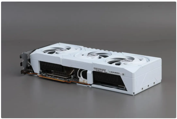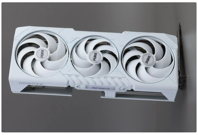 蓝宝石RX 9070 GRE极地OC显卡整体造型简洁流畅,线条硬朗,展现出一种科技感十足的工业美学。显卡尺寸大致为320 mm×120.25 (高)×61.6 (厚) mm,属于较为标准的三槽显卡,在保证内部充足散热空间的同时,也能适配大多数主流机箱。其主体采用了白色的外壳,搭配少量黑色元素进行点缀,形成了鲜明的对比,给人一种简约而不失精致的视觉感受。