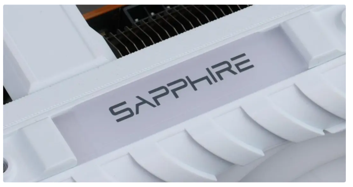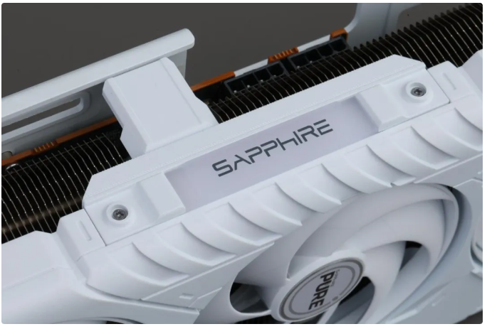 显卡正面配备了三个散热风扇,采用了独特的 “大小眼” 设计。左右两侧的风扇直径为10cm,中间风扇直径为9cm,并且中间风扇的旋转方向与两侧风扇相反。这种设计能够有效减少风扇之间的乱流,提高空气流动效率,增强散热效果。在顶部中央位置,是蓝宝石精心打造的一处RGB灯光区域,SAPPHIRE的英文标识镶嵌其中,当点亮灯光时,能够呈现出绚丽多彩的视觉效果,为用户的机箱增添一份独特的魅力。右侧则是RADEON的英文标识,彰显了其AMD显卡的身份。