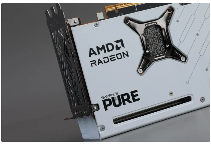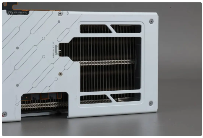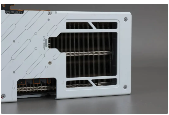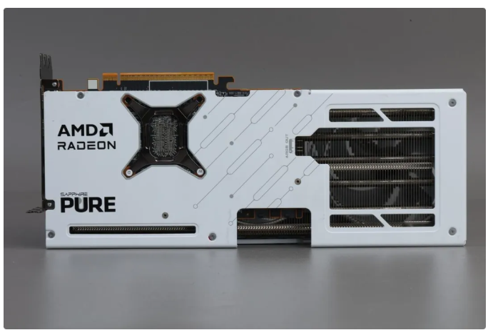 蓝宝石RX 9070 GRE极地OC显卡背板同样以白色为主色调,表面经过了阳极氧化处理,不仅具有良好的耐磨性和耐腐蚀性,还进一步提升了显卡的整体质感。背板采用了大面积的镂空设计,除了印有显卡型号信息以外,还点缀了一些精致漂亮的图案,这些镂空图案设计不仅减轻了背板的重量,还能帮助提升散热效率,优化机箱内部风道。蓝宝石RX 9070 GRE极地OC显卡还在背板的右侧做了穿透式设计,风扇吹出来的风可以经由此处直接吹透显卡,进一步加强散热效果,减少热量在显卡内部的积聚,为显卡全速稳定运行提供有力保障。