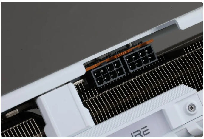 在顶部中间靠右的位置,是显卡的辅助供电区域,采用了双 8Pin 辅助供电接口设计,这种设计能够为显卡提供稳定、充足的电力供应,确保显卡在高负载运行时能够保持稳定的性能表现。