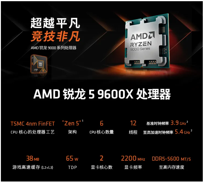 AMD锐龙5 9600X处理器采用了TSMC 4nm FinFET工艺制程的ZEN5架构,搭配6核心12线程的配置和高达5.4GHz的