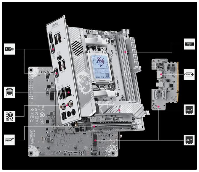 MPG X870I EDGE TI EVO WIFI 主板采用 12 层 1oz 铜箔服务器级 PCB,配备 8+2+1 项 Duet Rail 供电,其中 Vcore 部分采用 110A SPS DrMOS。