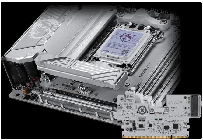 与此前英特尔 800 系平台上的 MPG Z890I EDGE TI WIFI 类似,这款 AM5 ITX 新品也在主 PCIe 插槽上方和内存插槽右侧设有两组子卡结构。